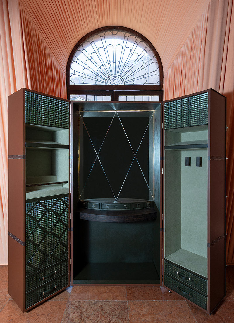This piece is imagined as a special commission for an elegant woman whose regular international travels require her to keep her precious essentials organised in one place. The trunk’s compartments are created for carrying beauty products, fragrances, garments and accessories, and when open, it can become a room’s centrepiece and a place to get ready.