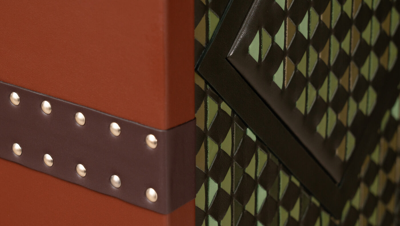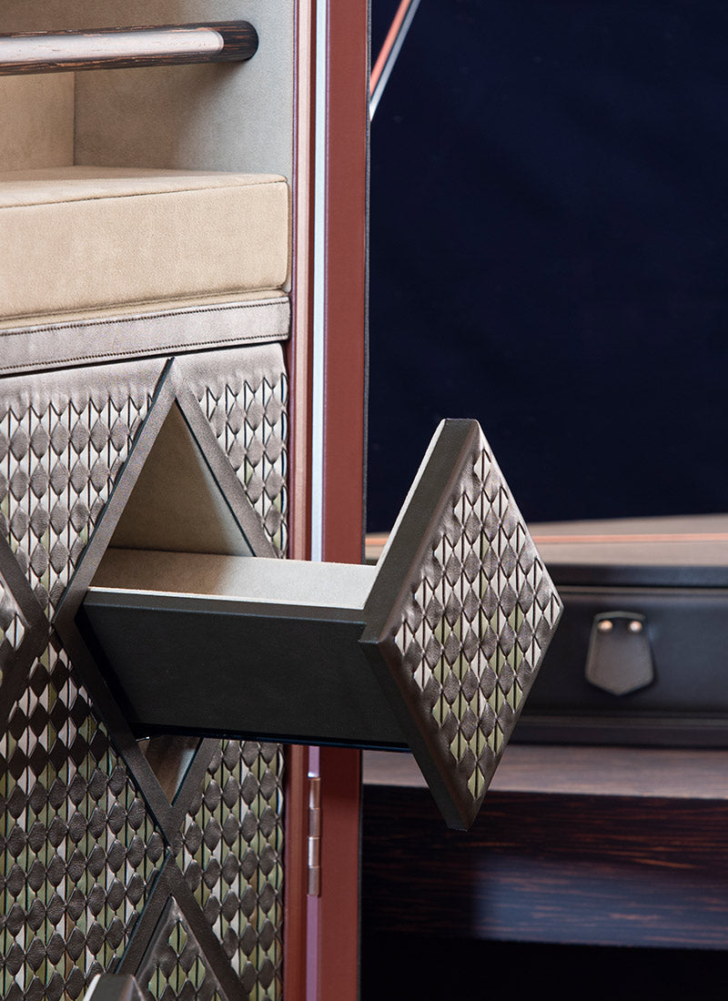 The imposing object is made of Palm Wood, and its interior is crafted in the company’s signature Mosaico technique, featuring strips of lamb nappa woven together by hand by a skilled artisan. A motif recurring across Serapian’s collections, the Mosaico has been a central part of the brand’s craft and a demonstration of the skilled artisans making each piece. Featuring 12 Mosaico drawers (6 of which are hidden from view), the trunk also includes a central backlit mirror characterised by a diamond-shaped engraving that references the iconic shape of the Mosaico pattern.