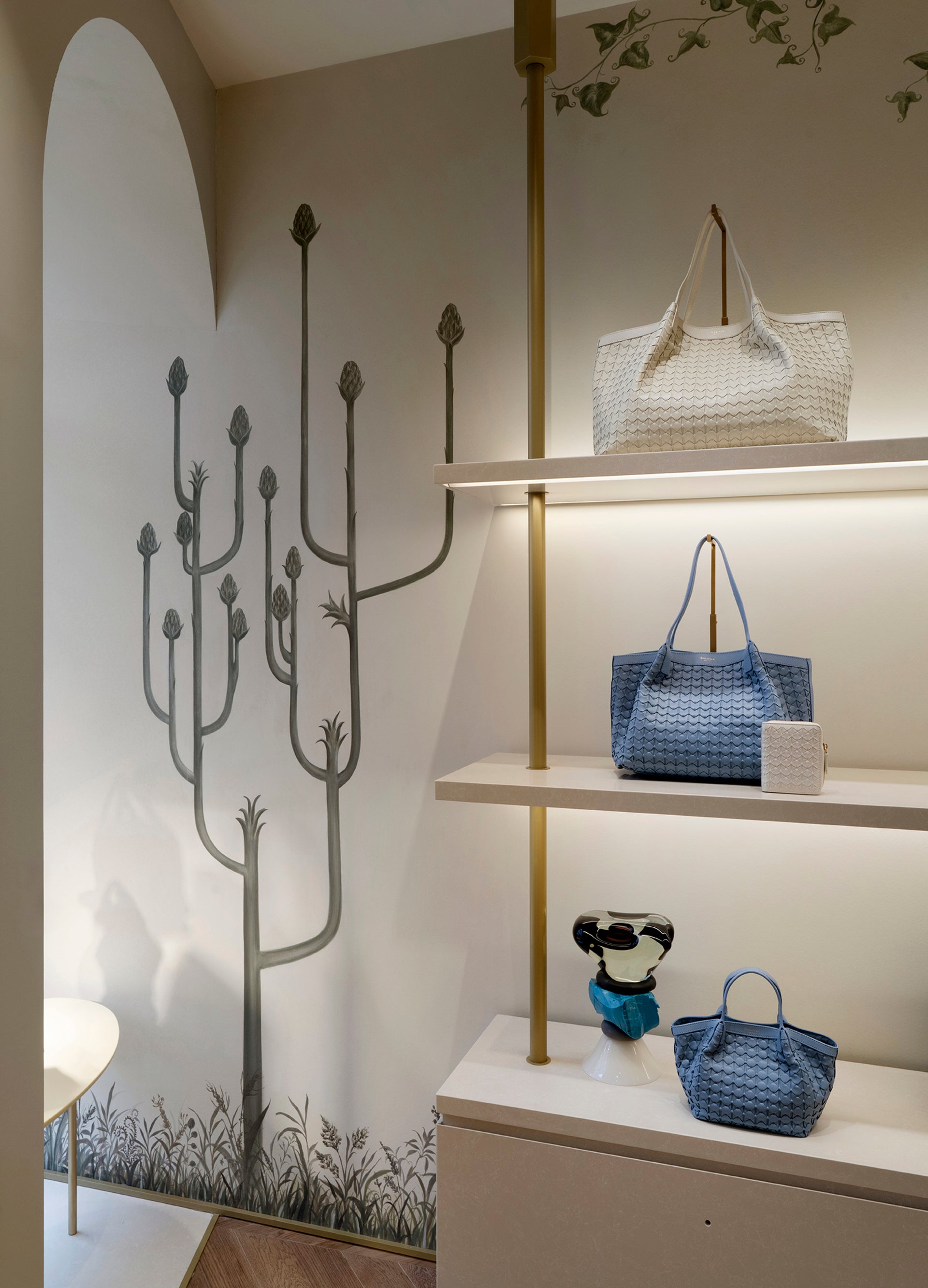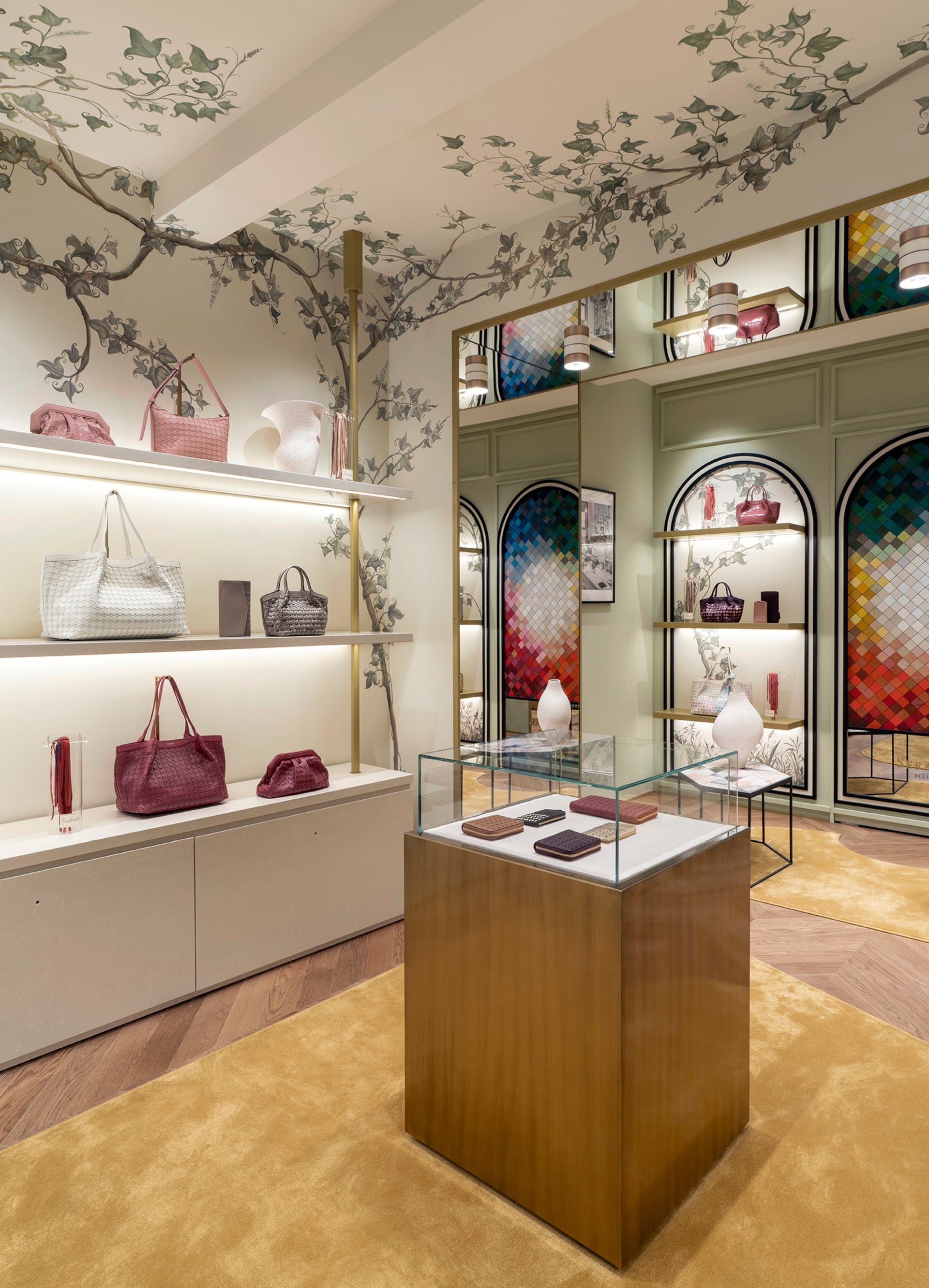 Portaluppi’s own Casa Degli Atellani is the inspiration behind this new Roman interior: the store features hand-painted walls by Pictalab, characterised by a botanical motif inspired by his historical private residence. This element also connects Serapian with the city of Rome, referencing Villa Medici, whose Stanza Degli Uccelli features a spectacular ceiling characterised by painted birds and vegetation.