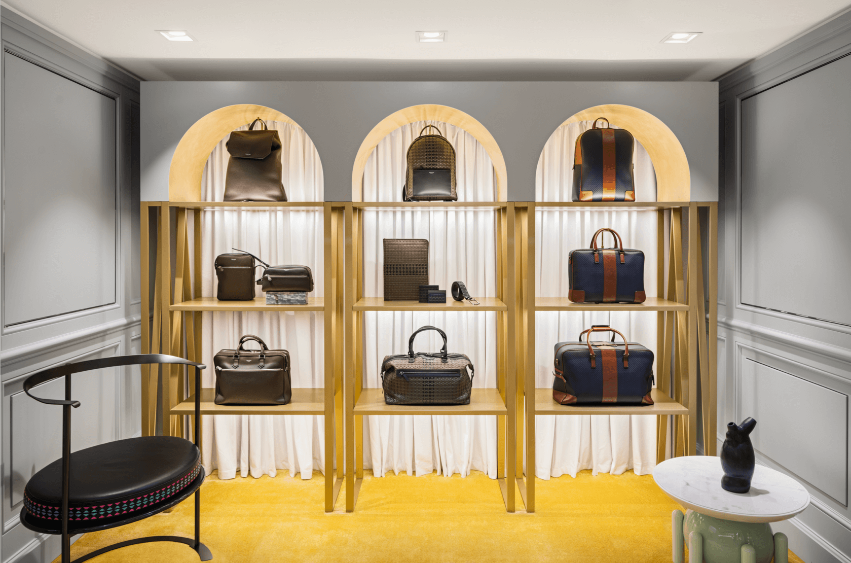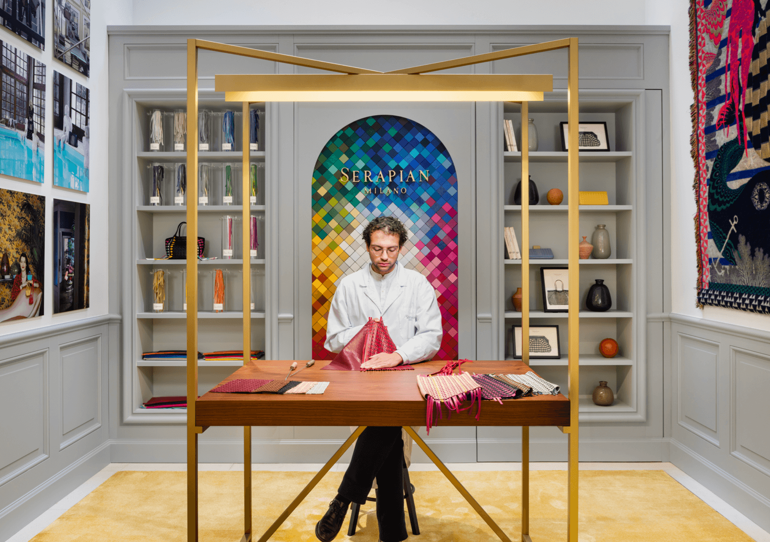 Taking center stage in the boutique is the Bespoke Salotto, the cornerstone of Serapian’s craft, which offers a personalization service to sophisticated customers looking for signature Mosaico creations, crafted from the nappa leather weaving technique that has been mastered by the Maison since Stefano Serapian introduced it in the 1940s.