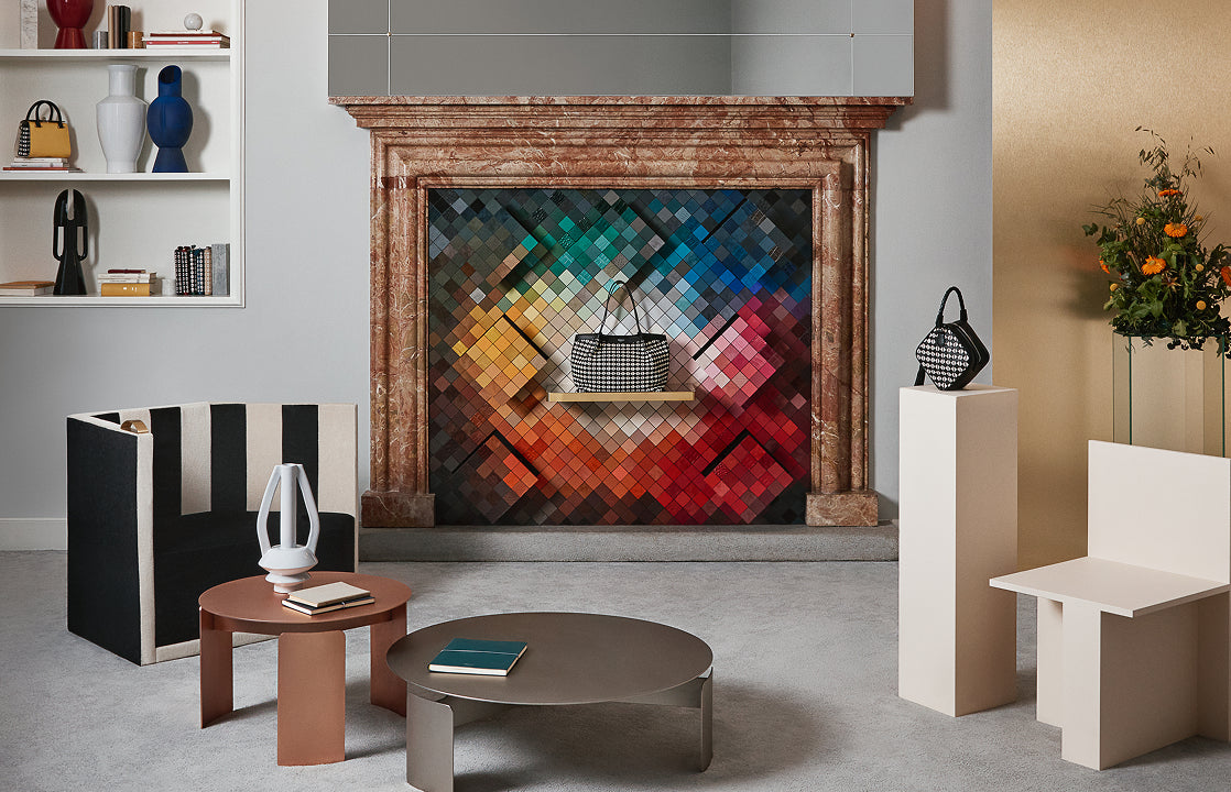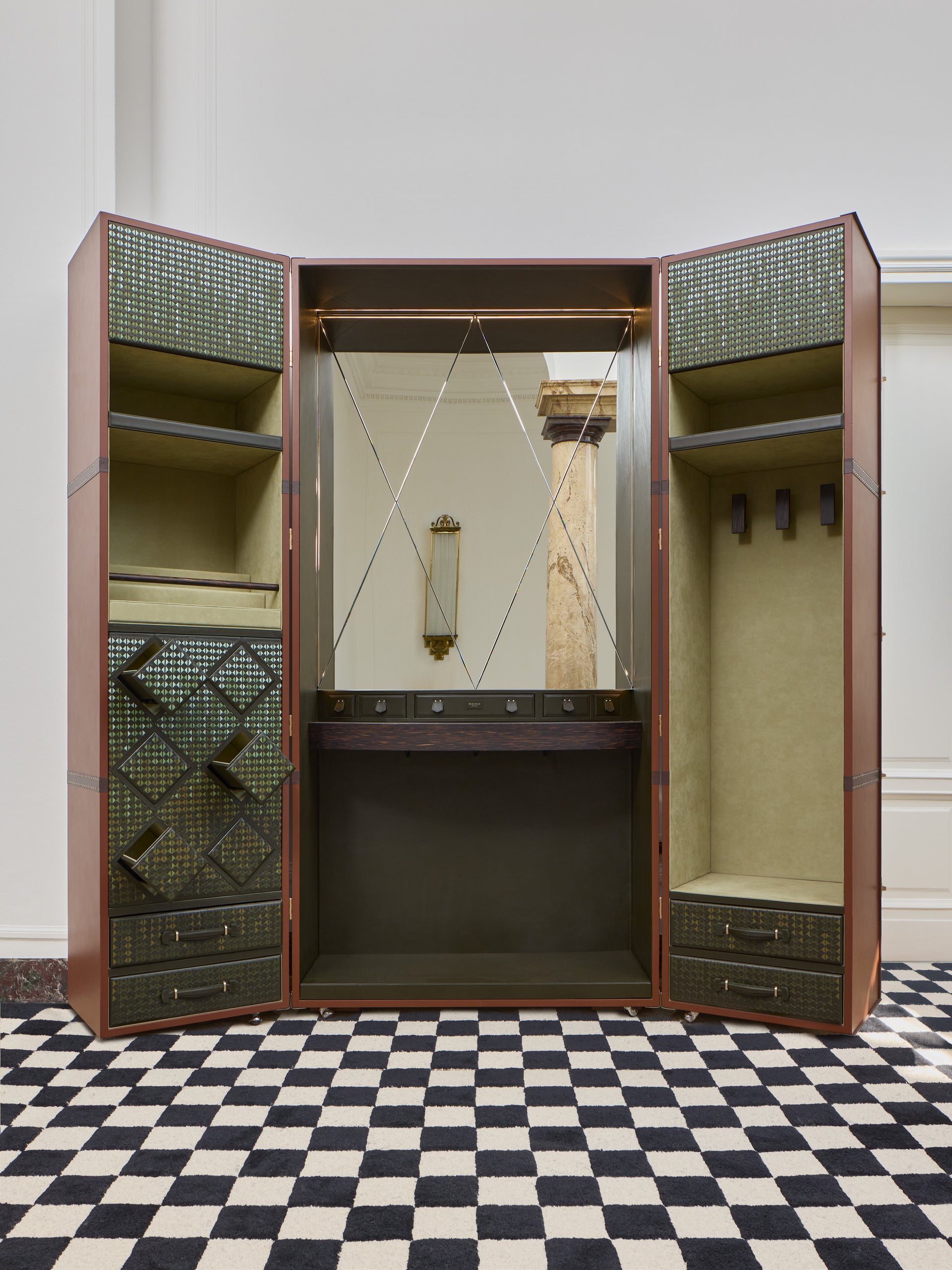 Inspired by 1950s film stars, this monumental piece features interiors crafted in Serapian Mosaico and is equipped with hidden drawers and a backlit, diamond-shaped mirror, two details that pay homage to the iconic Secret Bag.
